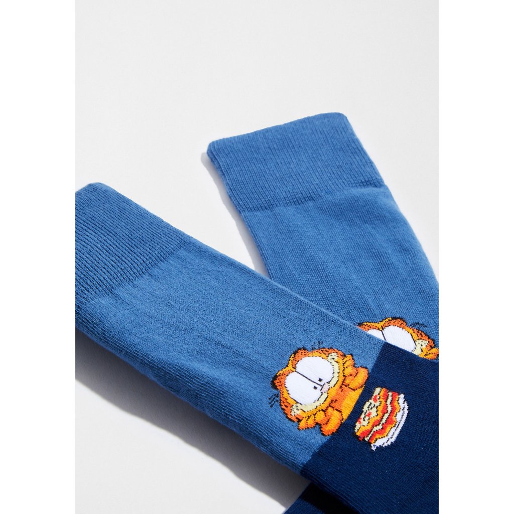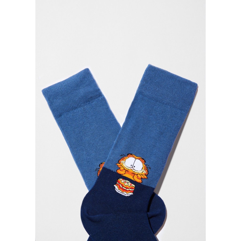Originálne ponožky BeGarfield Lasagna kombinujú dva odtiene modrej v štýle color block. Ilustrácia Garfielda sediaceho na lasagni v jeho typických oranžových farbách je umiestnená v mieste prechodu medzi dvoma farebnými blokmi v oblasti členka.