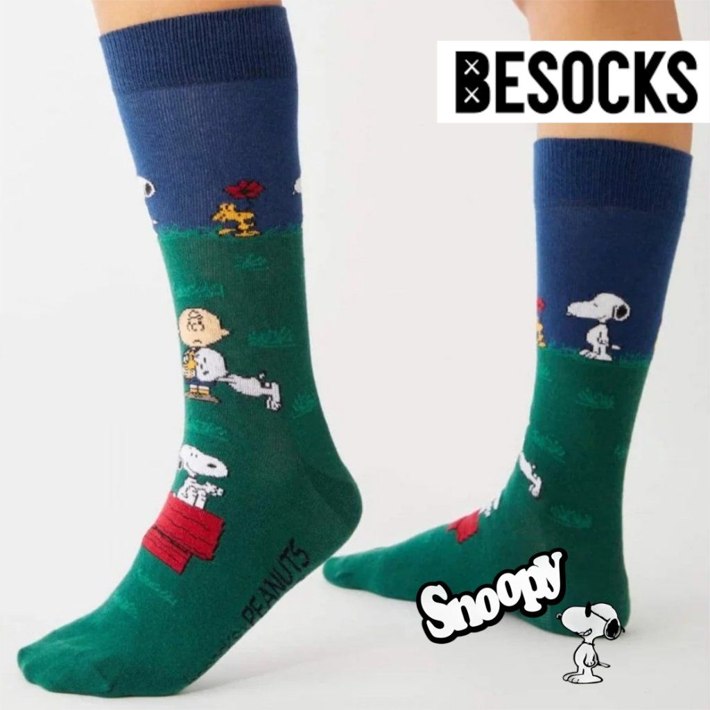 Originálne ponožky BeSnoopy Friends zobrazujú kontinuálnu scénu so Snoopym a jeho priateľmi na dvojfarebnom podklade – lesnej zelenej a tmavomodrej. Dizajn kombinuje jednoduchý vizuálny základ s vyváženými grafickými prvkami, vďaka čomu ich môžete ľahko skombinovať s množstvom rôznych odevov a štýlov.