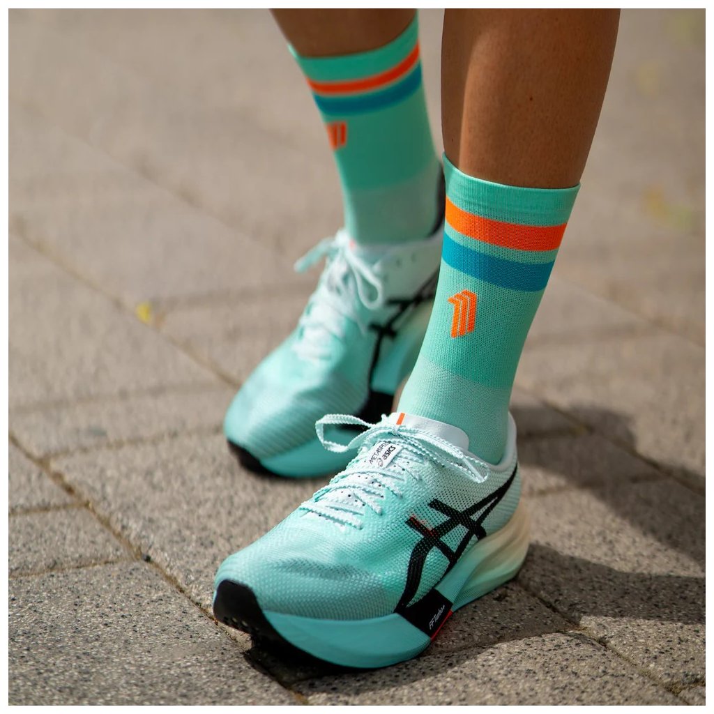 Bežecké ponožky s vyššou oporou v oblasti členka a prednej časti chodidla (metatarzu). Majú strednú úroveň kompresie, ktorá podporuje krvný obeh a znižuje zápaly pri dlhších behoch. Pätu a špičku tvorí COOLMAX® rúnová tkanina, ktorá minimalizuje nárazy a zvyšuje komfort a priedušnosť. Ponožky zároveň zabraňujú vzniku pľuzgierov.