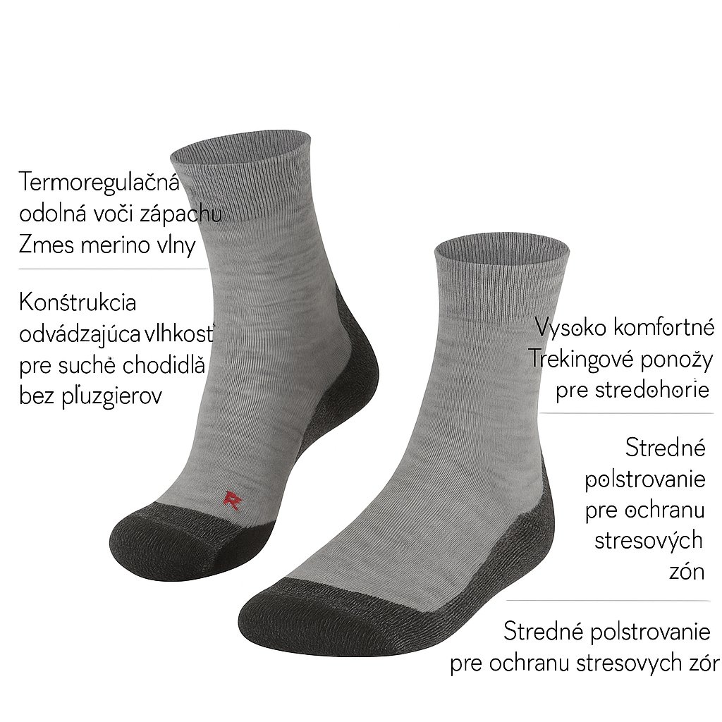 Dámske trekingové ponožky FALKE TK2 Explore Women so stredným polstrovaním a merino vlnou poskytujú vysoký komfort, účinnú termoreguláciu a suché chodidlá pri turistike v ľahkom teréne. Anatomický dámsky strih je prispôsobený užšiemu chodidlu.