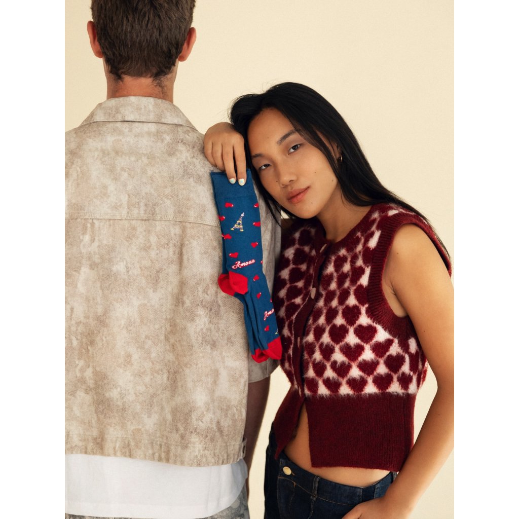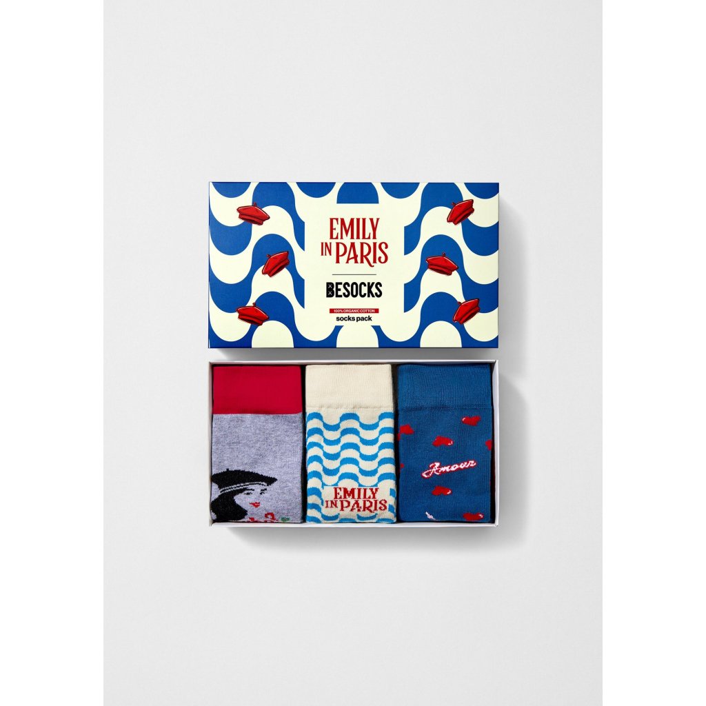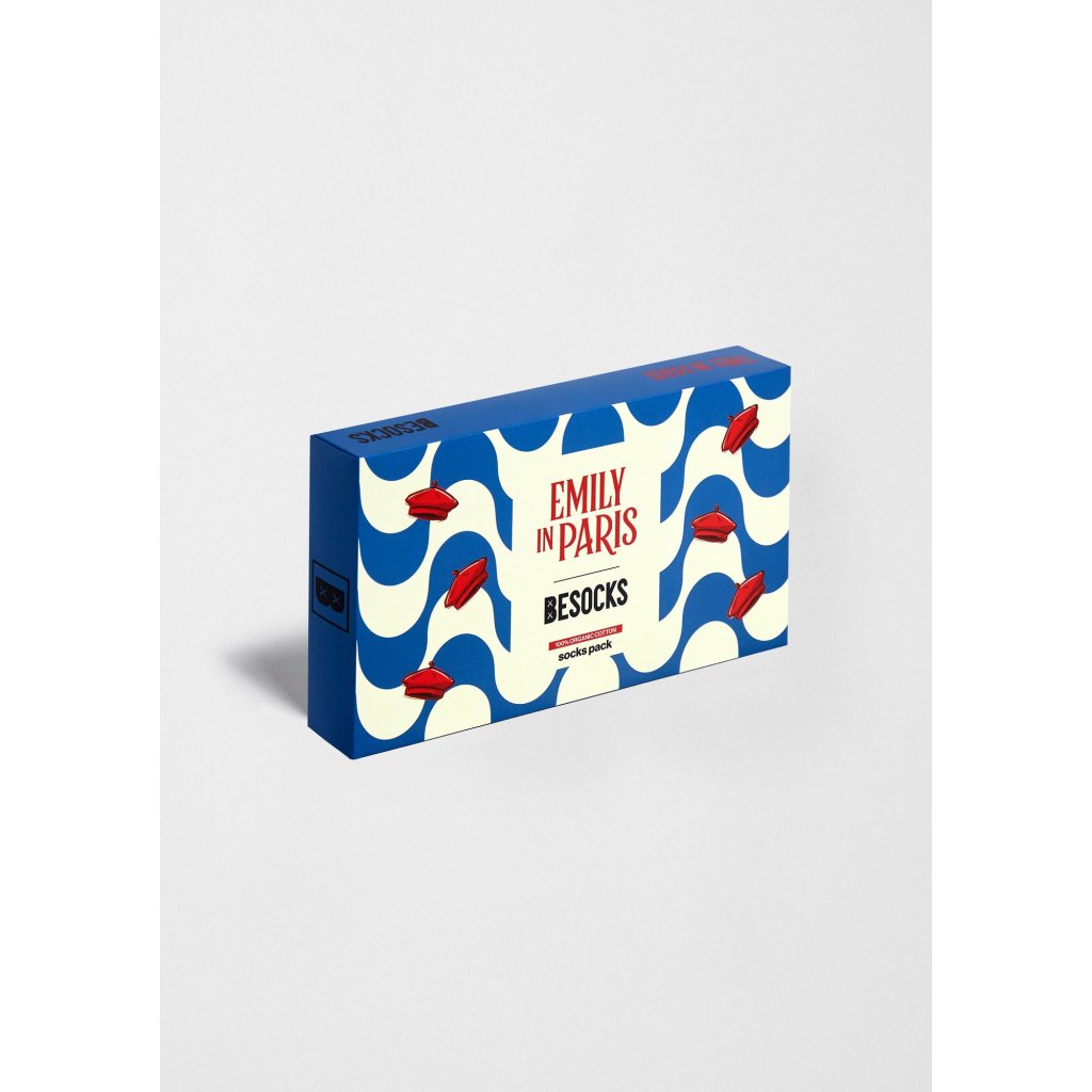 Balíček Emily in Paris x BESOCKS obsahuje tri originálne dizajny inšpirované vizuálnym svetom seriálu. Každý pár je vyrobený z organickej bavlny a má jedinečnú estetiku s najobľúbenejšími kúskami z kolekcie. Set je zabalený v ilustrovanej krabičke s krémovým a modrým pozadím, ozdobenej červenými baretmi.