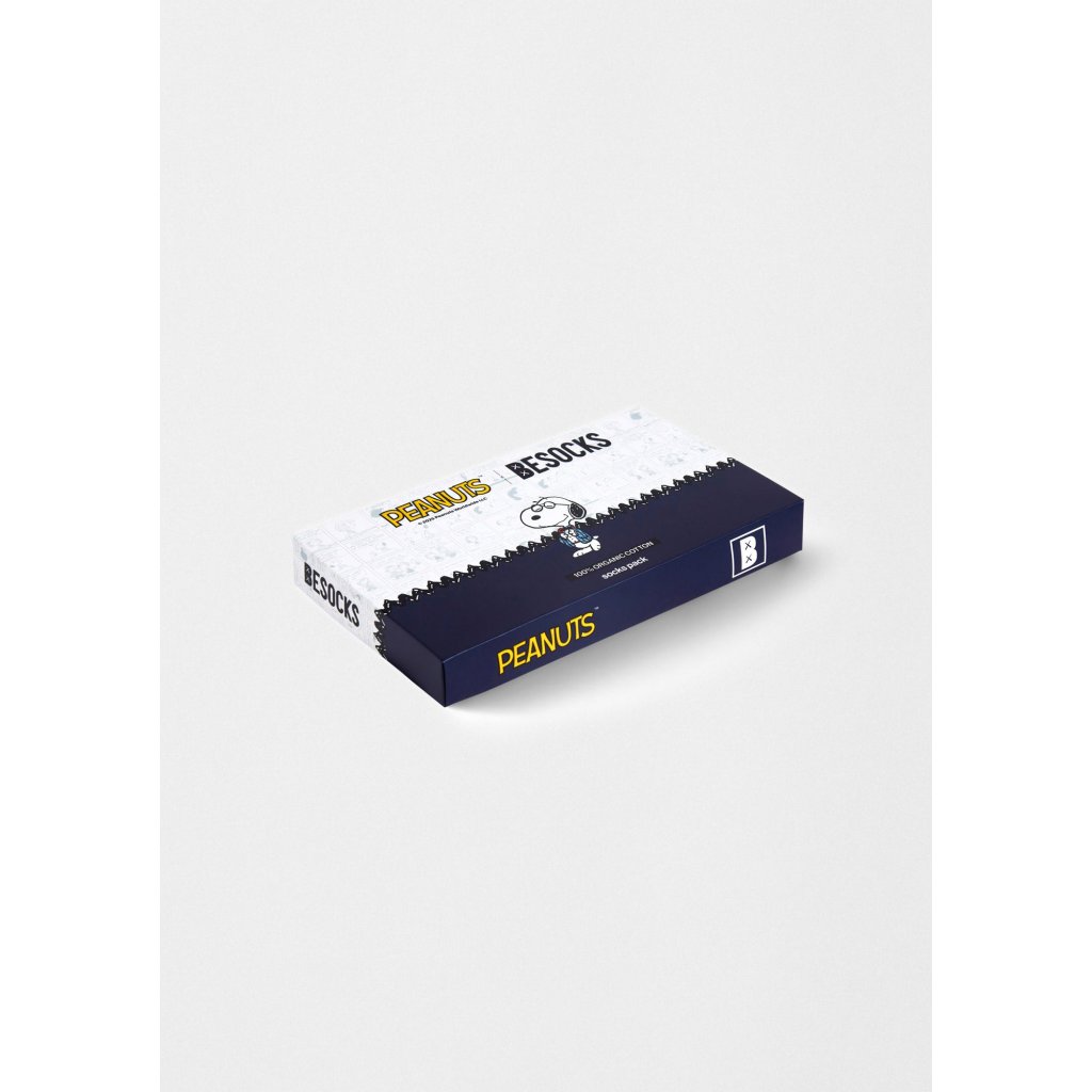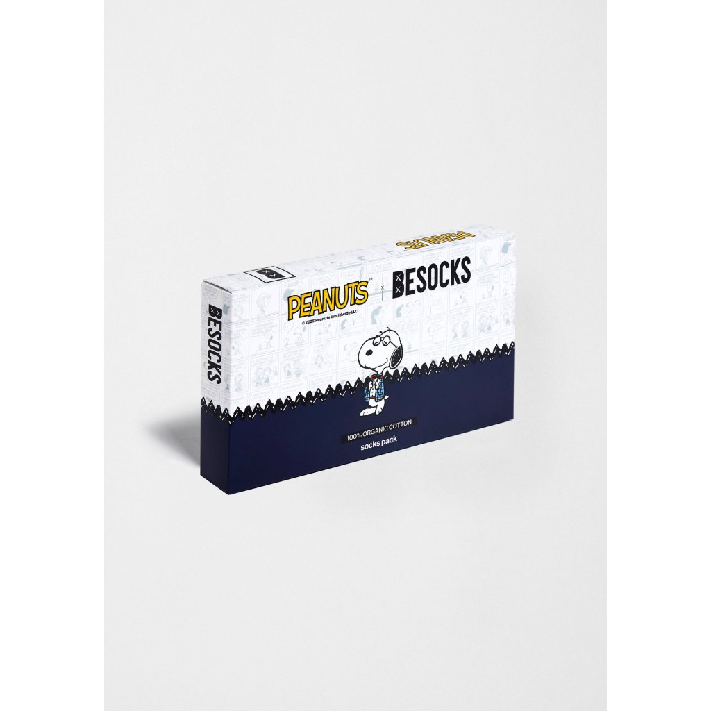 Balíček Peanuts x BESOCKS obsahuje tri originálne dizajny vyrobené z organickej bavlny a inšpirované Snoopym, legendárnou postavičkou z komiksového pásu. Každý model reprezentuje ikonický moment alebo štýl z casual kolekcie. Set je zabalený v ilustrovanej krabičke s bielym pozadím, zdobenou originálnymi bublinami z Peanuts a s tmavomodrou spodnou páskou, na ktorej vyniká Snoopy v jeho klasickom parížskom outfite.