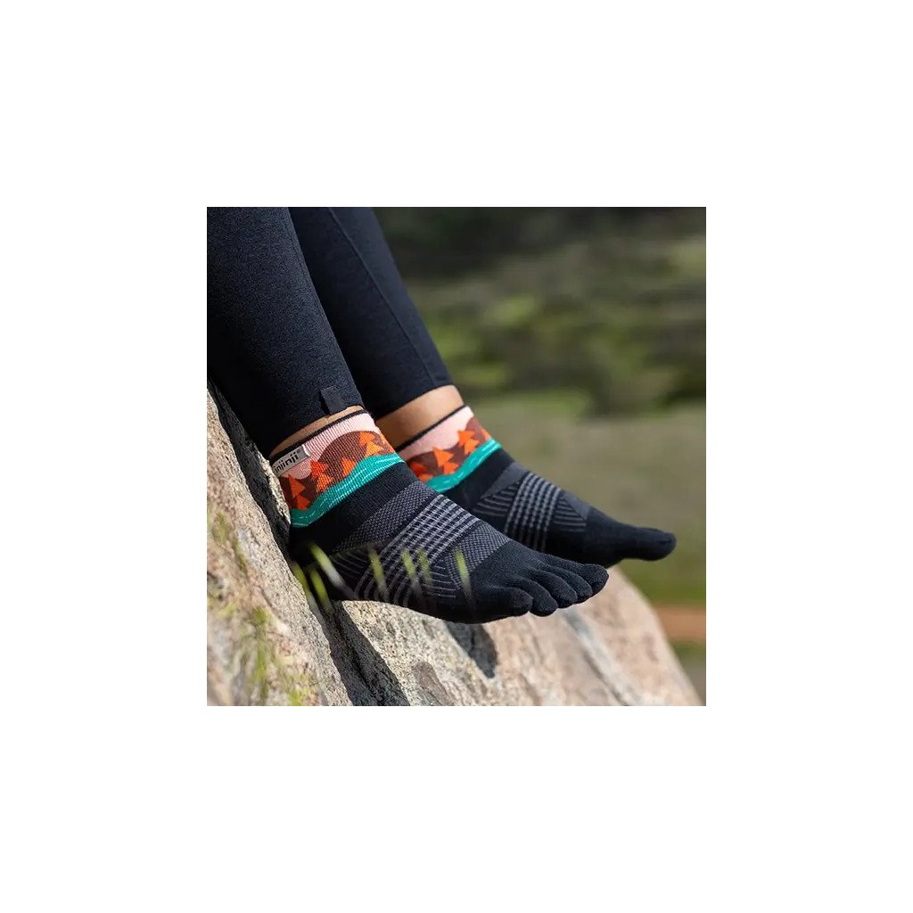 Navrhnuté pre ženy, ktoré behajú a rýchlo sa pohybujú v nerovnom teréne, Trail Midweight Mini-Crew prstové ponožky poskytujú pohodlie, ochranu a podporu. Dvojitý lem vo výške Mini-Crew bráni prenikaniu nečistôt a prachu, zatiaľ čo vlákna COOLMAX® EcoMade odvádzajú vlhkosť. Stredne hrubé polstrovanie v oblasti chodidla a podpora klenby zaisťujú komfort pri trailových behoch, zatiaľ čo jedinečný päťprstový dizajn minimalizuje pľuzgiere a umožňuje plné zapojenie chodidla aj na úzkych chodníkoch.